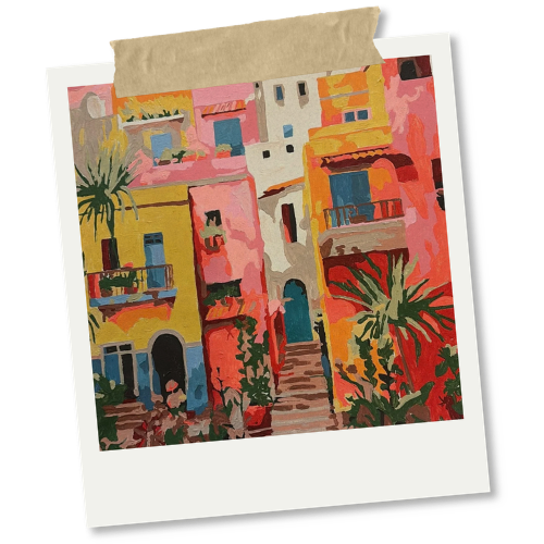 Zwischen farbenfrohen Fassaden, kleinen Balkonen und einem einladenden Café entfaltet sich das pulsierende Alltagsleben. Das warme Licht, die intensiven Rot- und Gelbtöne sowie die detailreiche Architektur verleihen dem Motiv seine besondere Atmosphäre.